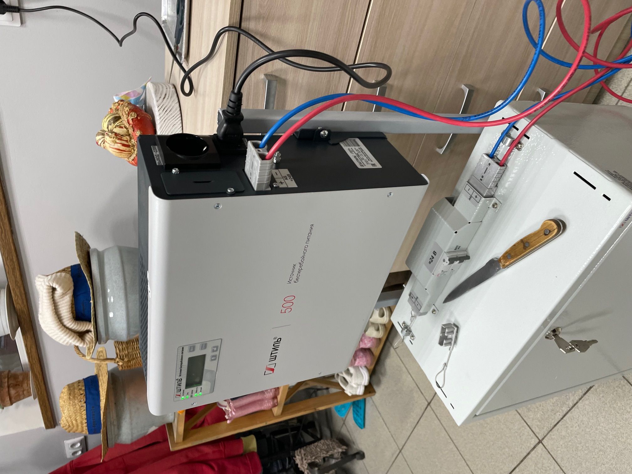 Спасибо! Действительно спасибо за ваш ИБП. Внешне он прекрасен, в купе с ящиком для аккумуляторов, считайте украшение котельной. Приобрел теще в дом, питать газовый котел, чтобы, при отключении электричества не терять отопления дома. С функциями справляется на отлично. По мощности купил с запасом в 80%. С двумя аккумуляторами на 100А по его рассчетам на 18 часов хватает, не пробовал, но доехать, завести генератор, в случае чего, успею. В процессе установки доработал конструкцию, не захотел на стену вешать ИБП. Пара труб, сварка, баллончик краски, и получилась прекрасная рама, которую я прикрепил к боксу для аккумуляторов, на которую в свою очередь навесил ИБП. За фото не бейте слишком, не в месте эксплуатации фотографировал, собирать было удобнее в гараже