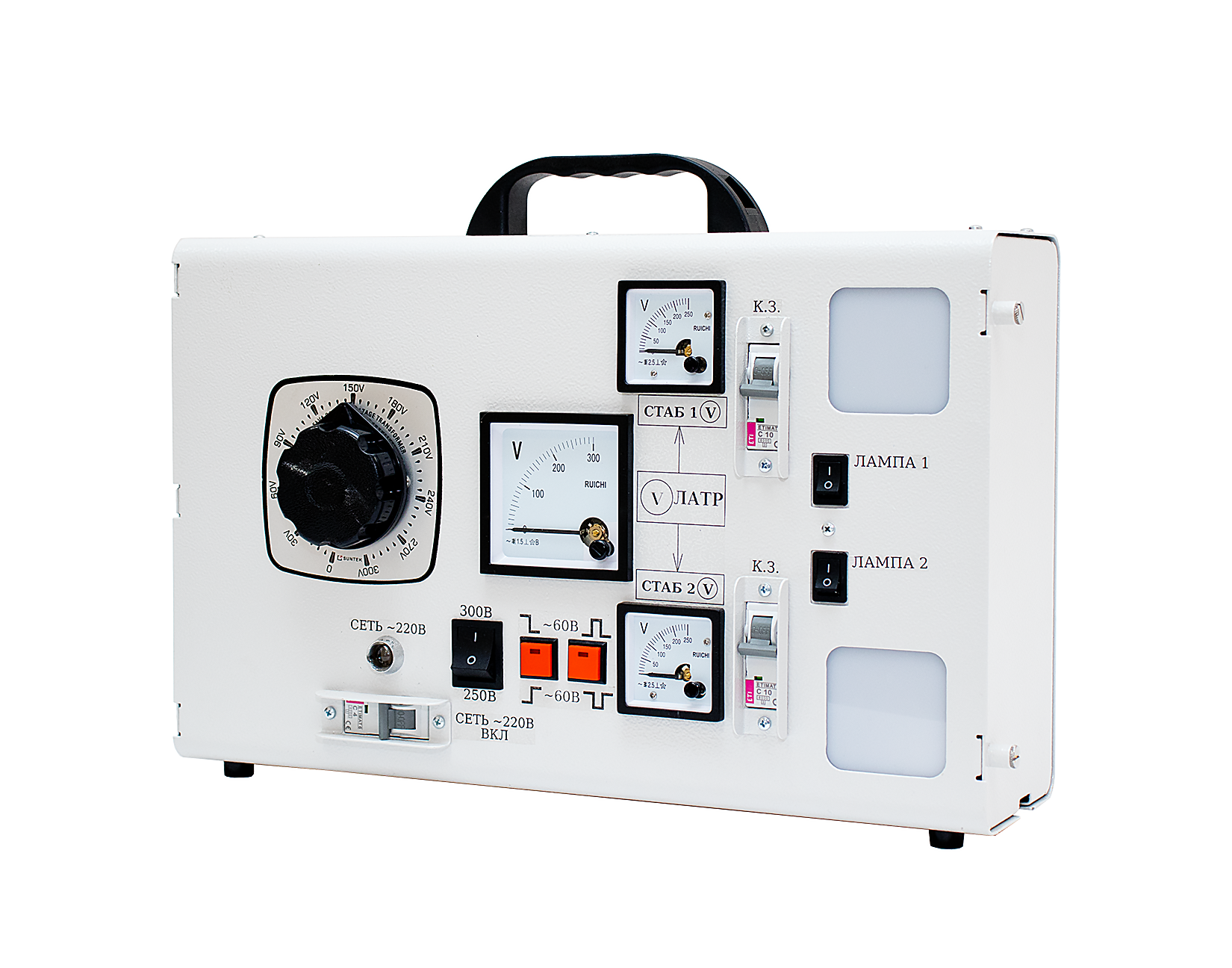 Стенд оснащён устройством регулировки однофазного переменного напряжения на основе автотрансформатора типа ЛАТР, вольтметрами стрелочного типа для контроля напряжений с выхода ЛАТР и с выходов подключенных стабилизаторов.