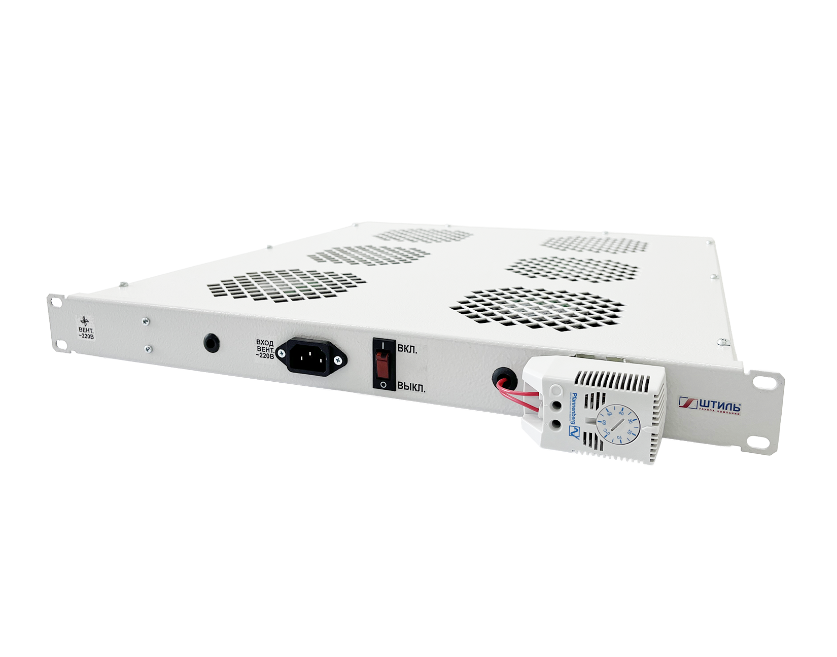 Вентиляторный модуль FM-1-6ST с терморегулятором монтируется в 19” направляющие телекоммуникационного шкафа глубиной 600 мм для обеспечения принудительной вытяжки нагретого воздуха из его внутреннего пространства.