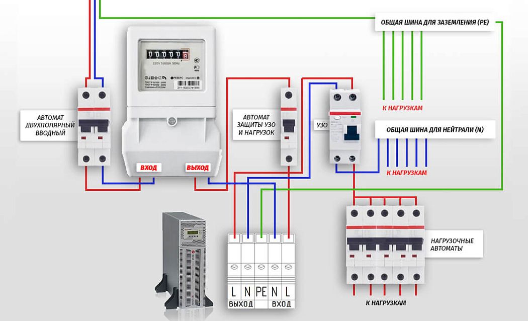 В состав типовой, однофазной схемы электроснабжения квартиры или частного дома входят: двухполюсный вводной автомат, счетчик потребляемой электроэнергии, группа нагрузочных автоматов, а также общая шина для земляных проводников и общая шина для нейтральных проводников. Кроме того, к перечисленному обычно добавляются дополнительные защитные устройства (УЗО или дифференциальные автоматы).
