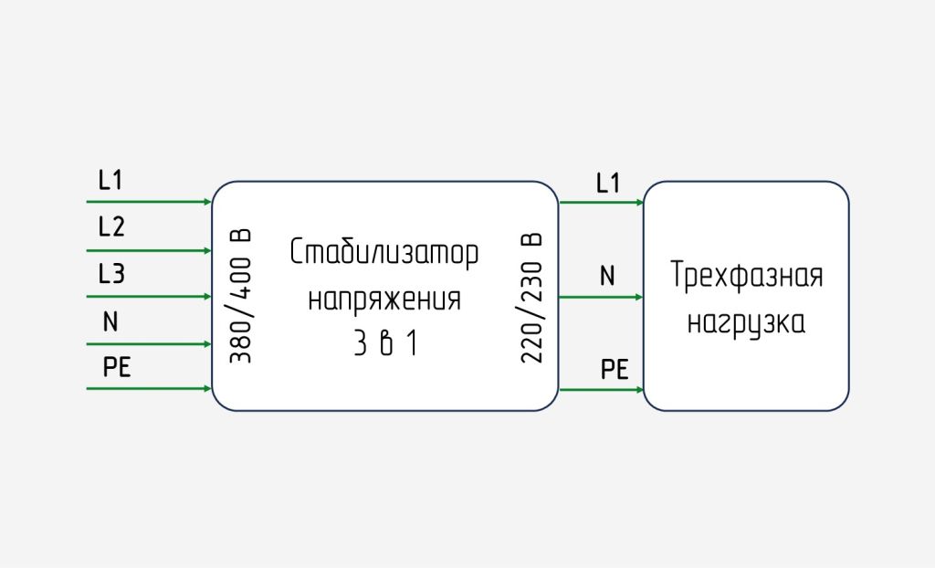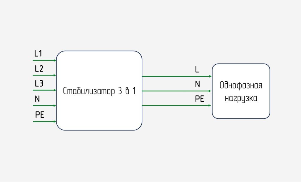 Существуют стабилизаторы с трехфазным входом и однофазным выходом (конфигурация – 3 в 1). Устройства позволяют запитывать нагрузку на 220 В сразу от всех фаз сети с номиналом 380 В (о том, когда это может понадобиться расскажем в пункте про выбор стабилизатора).