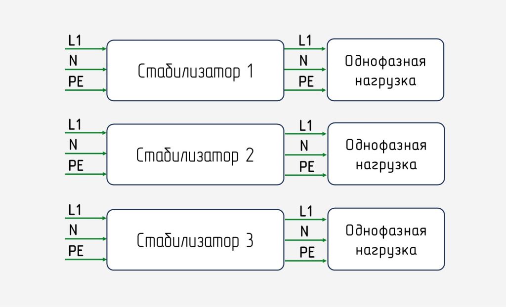 Производители вышерассмотренных стабилизаторов могут выстраивать трехфазное изделие двумя способами: