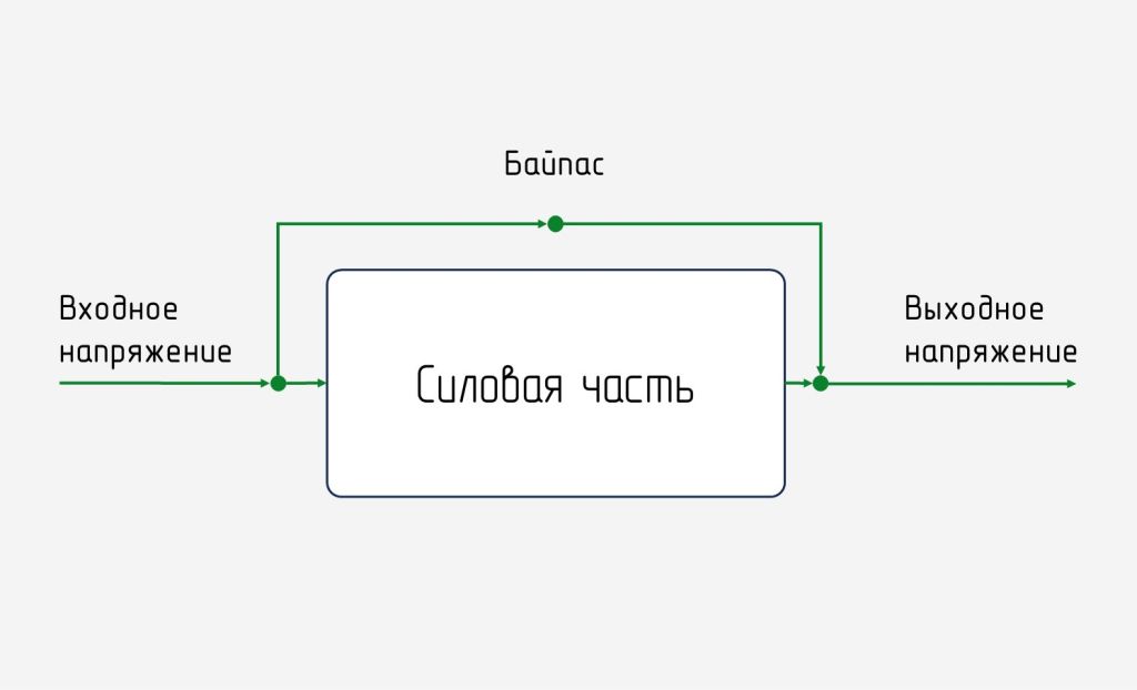Благодаря переключению на байпас электропитание нагрузки продолжится в случае перегрузки, перегрева или поломки силовой части. Однако, проходящее по цепи байпаса напряжение не стабилизируется и, соответственно, сохраняет все сетевые отклонения.