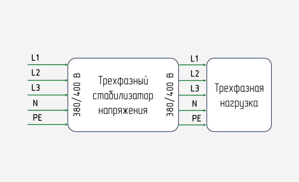 Трехфазный стабилизатор предназначен для подключения к трехфазной сети – его входной и выходной номиналы составляют 380 или 400 В.