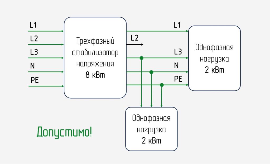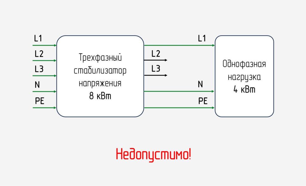 → Мощность однофазной нагрузки, подключённой к одной из выходных фаз трехфазного стабилизатора, не должна превышать 1/3 от всей мощности устройства.