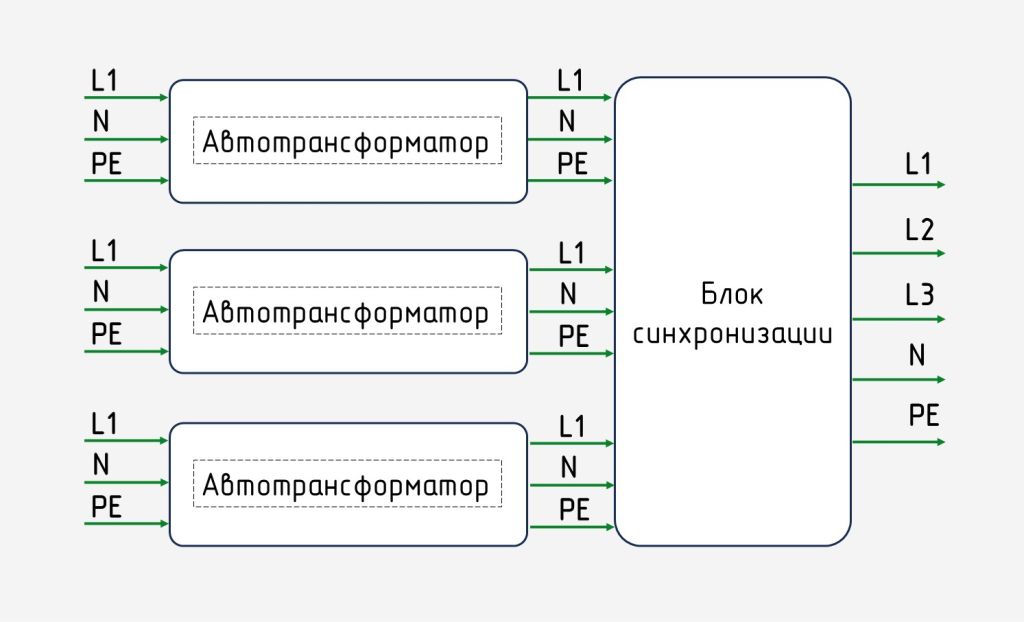 Классический трехфазный стабилизатор (3 фазы вход – 3 фазы выход, далее – 3 в 3) |