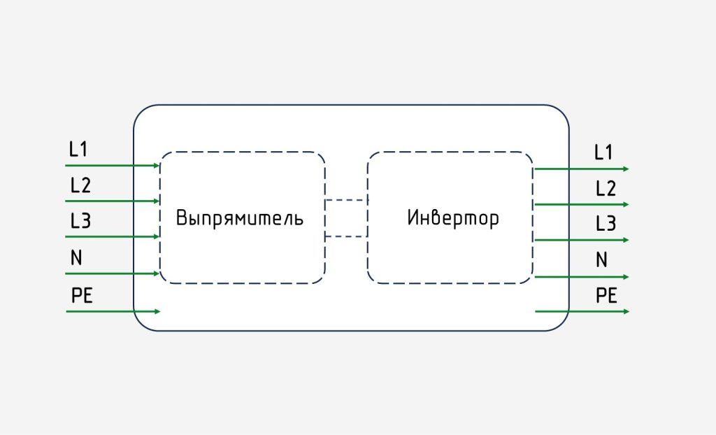 | Инверторный | Входное напряжение корректируется благодаря двойному преобразованию (из входного переменного в промежуточное постоянное и затем вновь в выходное переменное с требуемой формой и значением) | Последовательная работа полупроводниковых преобразователей – выпрямителя и инвертора | Постоянная регулировка напряжения независимо от его значения (если в настройках прибора не установлен иной режим работы) |