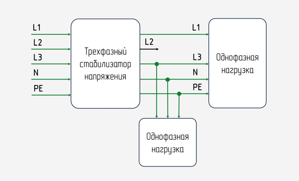 Большинство трехфазных стабилизаторов имеют встроенную цепь байпаса. Её наличие позволяет питать выход устройства напрямую от входа (т.е. от сети), минуя силовую часть.