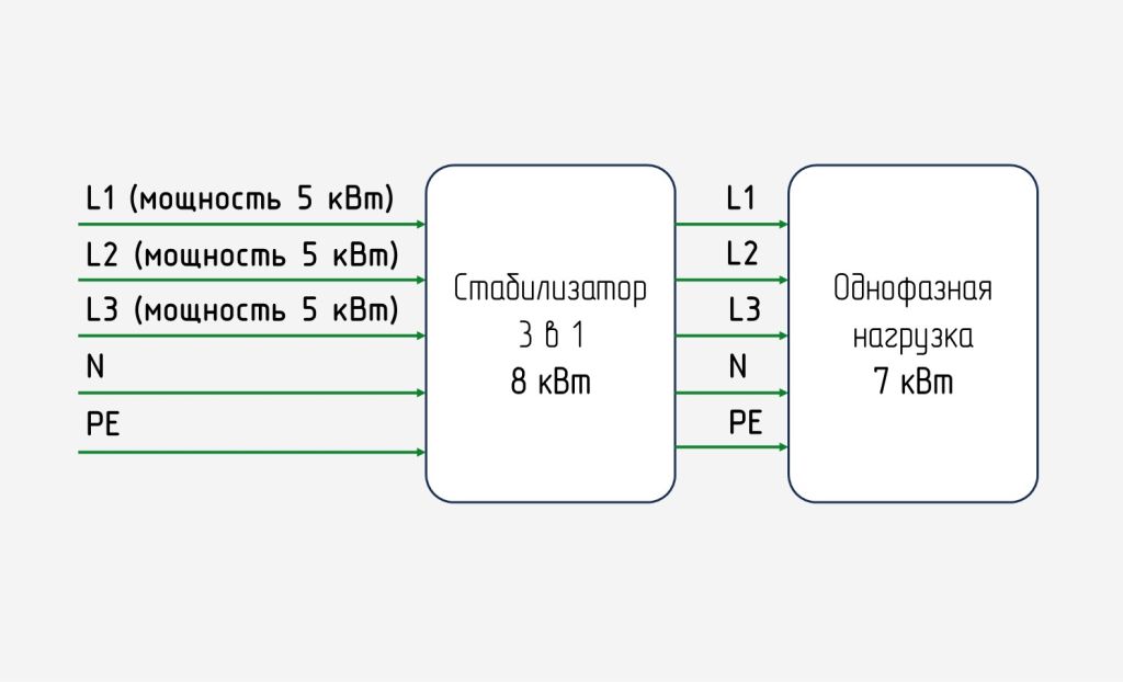 →Стабилизаторы конфигурации 3 в 1 – действенный и экономный способ запитать нагрузку на 220/230 В сразу от всей трехфазной сети с равномерным распределением энергопотребления между всеми питающими линиями. При этом мощность нагрузки может даже превышать мощность, выделенную на отдельную фазу.