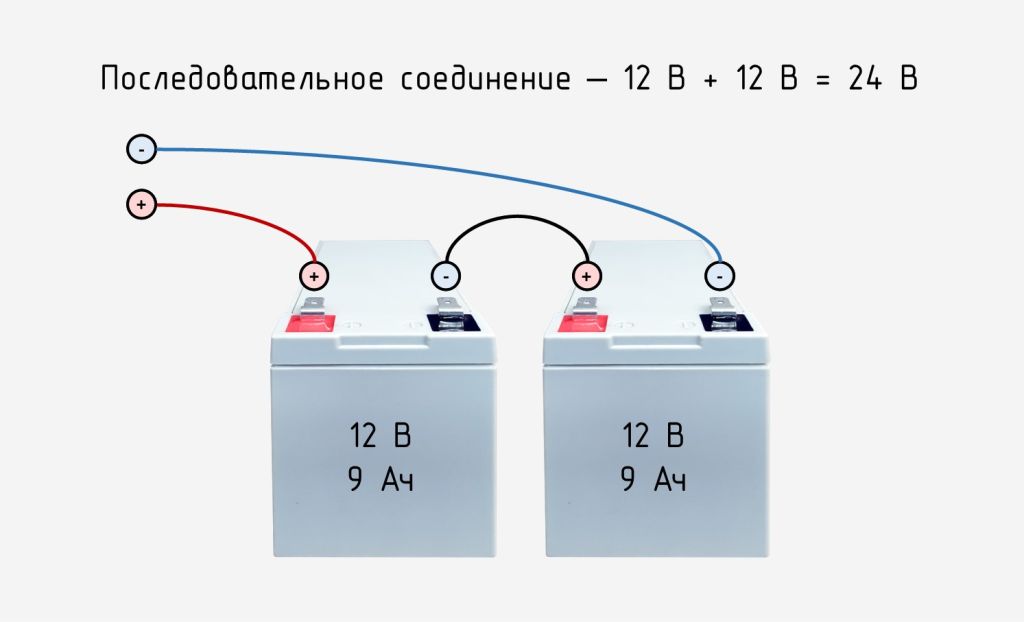Напряжение – 24 В, емкость – 40 Ач. Последовательное соединение отдельных аккумуляторов. Напряжение суммируется. Емкость не меняется.