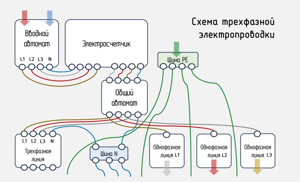 В случае с 3-фазной проводкой переменный ток подается уже по трем фазным проводам (L1, L2 и L3), а по нейтральному (N) возвращается. Присутствует и заземляющий провод (РЕ). При этом: