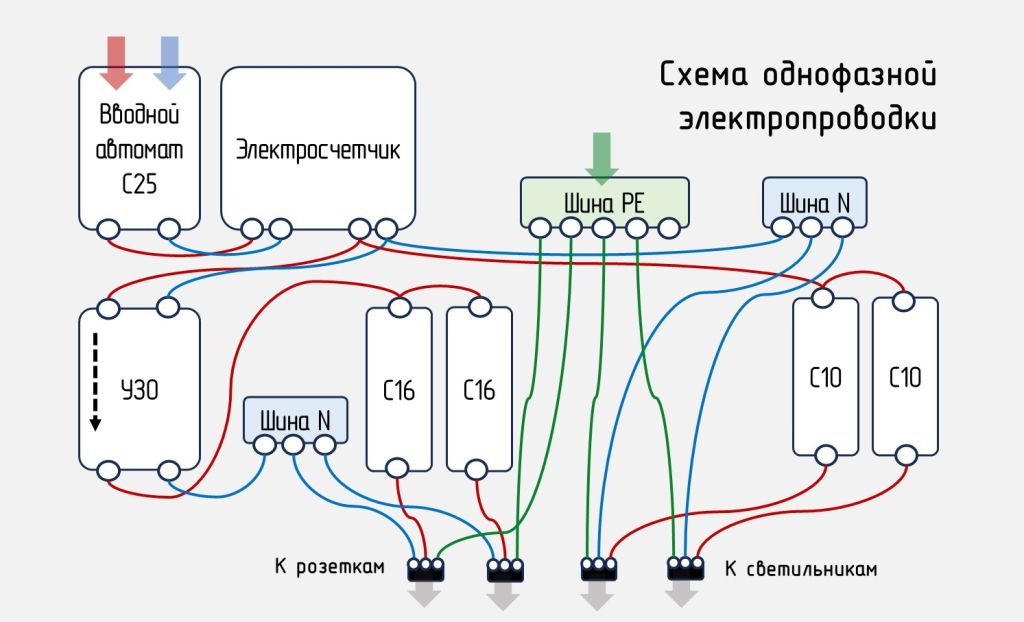 В квартирах или дачных домах обычно электропитание потребителей выполняется напряжением 220 вольт от линии, которая рассчитана на пять киловатт. В само домовладение заходит электрический кабель, состоящий из трех проводников: фазы (L), нейтрали (N) и защиты (РЕ) от контура заземления. По фазному проводу ток поступает к потребителю, а по нейтрали возвращается. Защитный проводник служит для предотвращения удара током.