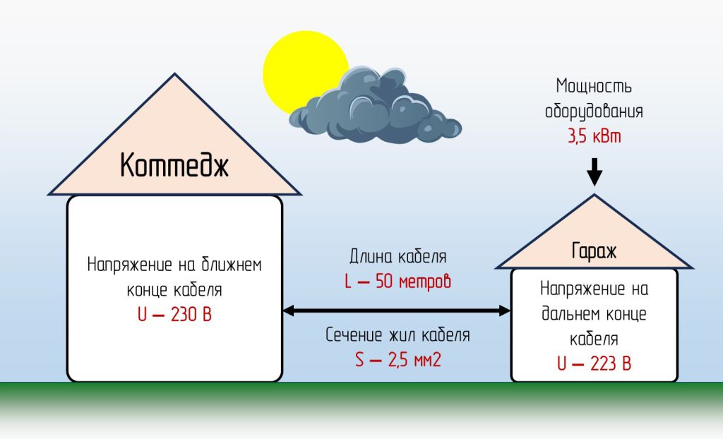 К примеру, от объекта (коттедж) до гаража с подсобными помещениями расстояние 50 м. Электросеть с номинальным напряжением 230 В. В конечной точки цепи подключены электроприборы с максимальным потреблением 3,5 кВт. От начальной до конечной отметки потребуется кабель с медными жилами и сечением 2,5 мм².